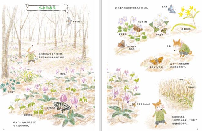 这本书很吸引我的地方,也在这里。作者在讲述这个故事时,采用图文并茂的形式阐述,很温柔细致的彩铅画,配以简单的文字讲解。细节之处做得非常到位——每种动物植物的形象绘画得非常美丽特征明显,配图标注也非常清晰。不禁让我们眼前一亮——我见过这种植物,原来它叫这个名字。
