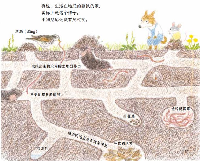 如果你觉得这是单纯的绘画画本,那可就错了。作者不仅画这些动植物,也为我们做科普。比如,在讲到鼹鼠时,在绘本中就为我们呈现了鼹鼠的巢穴。