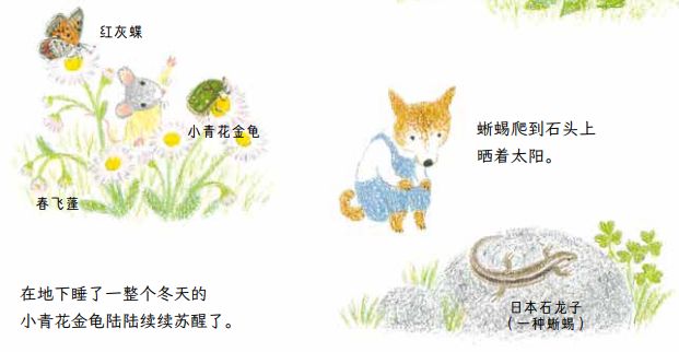 在整个春天里,作者发现了各种各样的动植物。大地被植物凸出的绿芽覆盖,蒲公英开满了黄色的小花,花上有甲虫和各种蝴蝶,石头上有趴着晒太阳的蜥蜴。