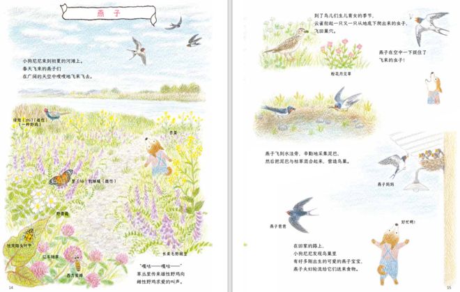 在《小狗尼尼的春与夏》里,讲到的燕子,野鸭,夏虫,都非常的细致,我们从这些连续的铅彩画里,能读出故事感,也能读出知识感。特别是在每本书的最后,将书中出现的动植物名字又按照大小写字母排序的方式整合一下,对一些特别的动植物,又附以文字的科普。
